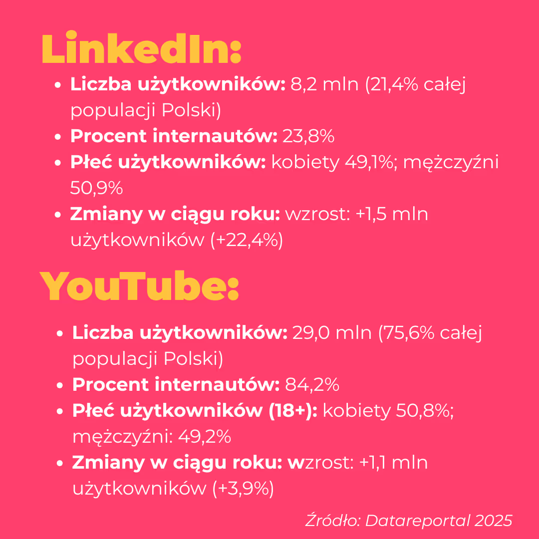 YouTube to wyszukiwarka numer dwa na świecie. Jeśli tworzysz treści edukacyjne — poradniki, instrukcje, odpowiedzi na pytania klientów — to idealna przestrzeń. Wymaga więcej zasobów, ale daje trwałe efekty. W wielu branżach jest jeszcze niszowym kanałem social media, głównie ze względu na barierę wejścia. Może stanowić jeden z wyróżników komunikacyjnych.
